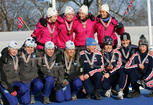 : Winning relay team of Norway with members Marit Liland Fredriksen, Ingunn Weltzien, Marie Elden and Betty-Ann Bjerkreim Nilsen, second placed relay team of Sweden with members Emma Bergman, Anna Simberg, Anna Hansson and Charlotte Kalla, and third placed relay team of Russia with members Nina Ryusina, Larissa Shaidurova, Tatiana Morogova and Svetlana Ovhinnikova are celebrating their silver medals won in 4x3.3km Junior Women relay race of FIS Nordic Junior Ski World Championships which was held in Medvode, Slovenia on 5.February 2006.