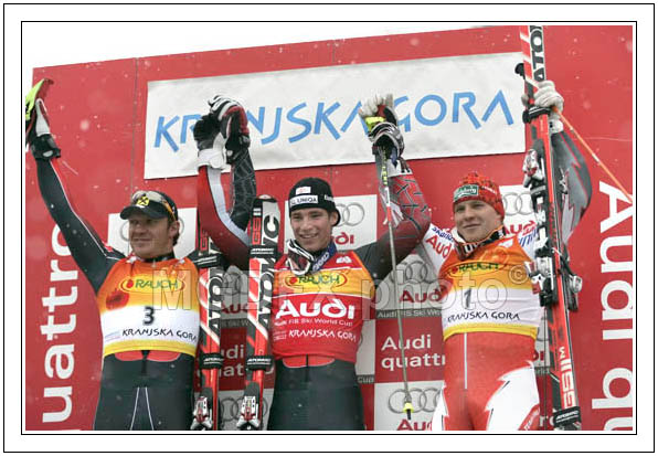 : Second placed Hermann Maier of Austria (L), winner Benjamin Raich of Austria (M) and third placed Kalle Palander of Finland (R) celebrating their medals on giant slalom race of Audi Alpine Skiing World Cup in Kranjska Gora. Race was won by Benjamin Raich of Austria, who finished before his teammate Hermann Maier of Austria and third placed Kalle Palander of Finland.