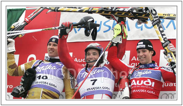 : Second placed Andre Myhrer of Sweden (L), winner Giogio Rocca of Italy (M) and third placed Benjamin Raich of Austria celebrating their medals after slalom race of Audi FIS Alpine skiing world cup in Kranjska Gora, Slovenia.