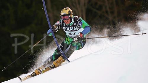 : Drago Grubelnik of Slovenia skiing during FIS World Cup Slalom race in Kranjska Gora, Slovenia. Race was won by Giorgio Rocca of Italy, Thomas Grandi of Canada placed second, while Ted Ligety of USA finished third. Grubelnik finished 12th.