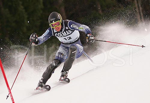 : Ted Ligety of USA skiing during FIS World Cup Slalom race in Kranjska Gora, Slovenia. Race was won by Giorgio Rocca of Italy, Thomas Grandi of Canada placed second, while Ted Ligety of USA finished third.