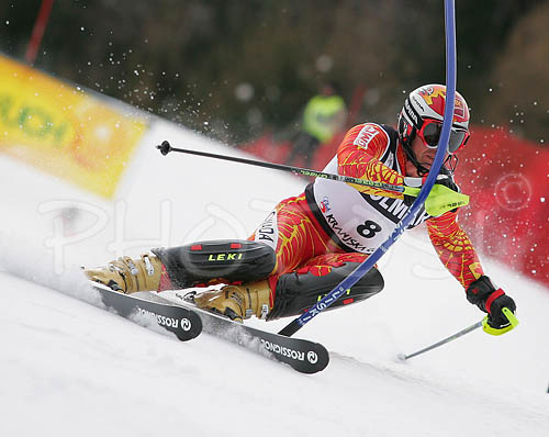 : Second placed Thomas Grandi of Canada skiing during FIS World Cup Slalom race in Kranjska Gora, Slovenia. Race was won by Giorgio Rocca of Italy, Thomas Grandi of Canada placed second, while Ted Ligety of USA finished third.