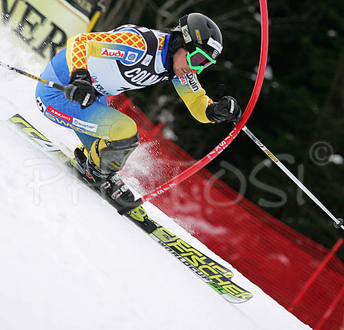 : Markus Larsson of Sweden skiing during FIS World Cup Slalom race in Kranjska Gora, Slovenia. Race was won by Giorgio Rocca of Italy, Thomas Grandi of Canada placed second, while Ted Ligety of USA finished third. Larsson finished 17th.