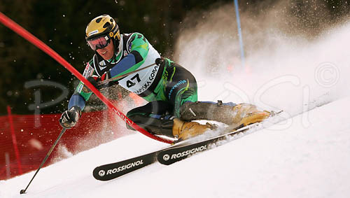 : Drago Grubelnik of Slovenia skiing during FIS World Cup Slalom race in Kranjska Gora, Slovenia. Race was won by Giorgio Rocca of Italy, Thomas Grandi of Canada placed second, while Ted Ligety of USA finished third. Grubelnik finished 12th.