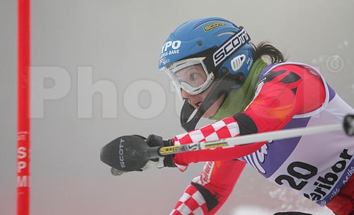 : Ana Jelusic of Croatia skiing during first run of Women FIS World Cup Slalom race in Maribor, Slovenia. Race was won by Marlies Schild of Austria, Janica Kostelic of Croatia placed second, and Therese Borssen of Sweden finished third.