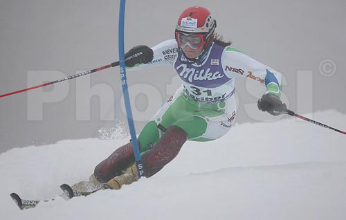 : Tina Maze of Slovenia skiing during first run of Women FIS World Cup Slalom race in Maribor, Slovenia. Race was won by Marlies Schild of Austria, Janica Kostelic of Croatia placed second, and Therese Borssen of Sweden finished third.