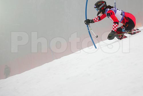 : Matea Ferk of Croatia skiing during first run of Women FIS World Cup Slalom race in Maribor, Slovenia. Race was won by Marlies Schild of Austria, Janica Kostelic of Croatia placed second, and Therese Borssen of Sweden finished third.