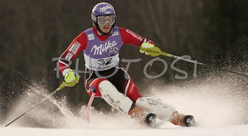 : Tina Maze of Slovenia skiing in first run of Women Alpine skiing slalom FIS World Cup in Kranjska Gora, Slovenia. Golden Fox trophy was held in on 7th of January 2007 in in Kranjska Gora, Slovenia, as replacement for Maribor, Slovenia, where organizers couldnt prepare track due high temperatures.