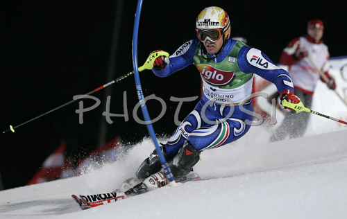: Giorgio Rocca of Italy skiing in first run of Men Alpine skiing slalom FIS World Cup in Schladming, Austria. Men slalom FIS Alpine skiing World Cup was held on 30th of January 2007 in Schladming, Austria.