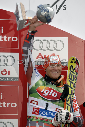 Solden ,Austria - 28.10.2007 : Kalle Palander of Finland celebrating his third place after first race of season 2007-2008. Men giant slalom race was first race of FIS Alpine skiing World cup and was traditionally held on glacier Soelden, Austria on 28th of October 2007. Photo by: Photo SI/PhotoSI