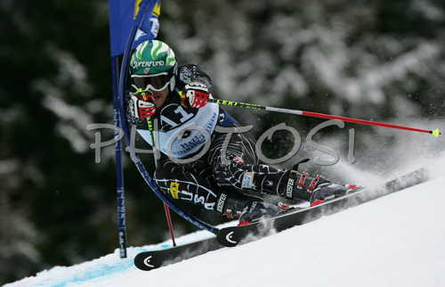 : 7th placed Bode Miller of USA skiing in second run of men giant slalom race of Audi FIS Men Alpine skiing World Cup 2008. Giant slalom race was held in Bad Kleinkirchheim, Austria on 8th of December 2007.