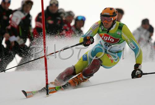 : Mitja Valencic of Slovenia skiing in first run of men slalom race of Audi FIS Men Alpine skiing World Cup 2008. Slalom race was held in Bad Kleinkirchheim, Austria on 9th of December 2007.