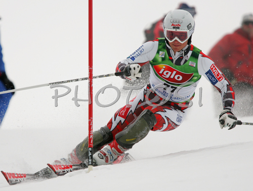 : Marcus Sandell of Finland skiing in first run of men slalom race of Audi FIS Men Alpine skiing World Cup 2008. Slalom race was held in Bad Kleinkirchheim, Austria on 9th of December 2007.