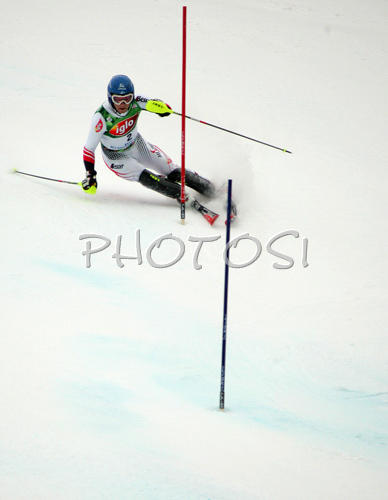 : Winner Benjamin Raich of Austria skiing in second run of men slalom race of Audi FIS Men Alpine skiing World Cup 2008. Slalom race was held in Bad Kleinkirchheim, Austria on 9th of December 2007.