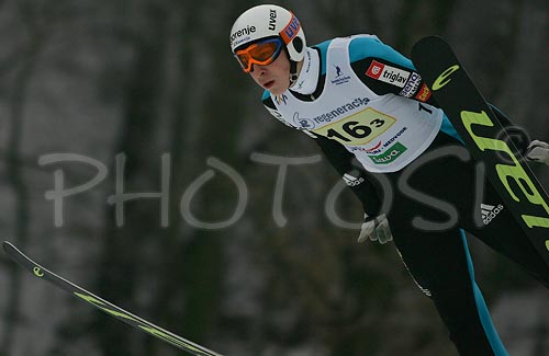 : Jurij Tepes of Slovenia soars through the air during Junior ski jumping team race of FIS Nordic Junior Ski World Championships. Race was won by Austria, Slovenia placed second, while Japan finished third.