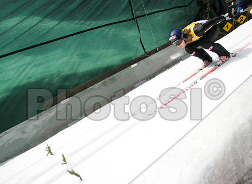 : Ski jumper on inrun of ski flying hill in Planica, Slovenia during qualification jump for Saturdays e.on Ruhrgas FIS Ski Jumping World Cup finals. Qualifications were held in Planica, Slovenia on 17.March 2006. 15 best placed ski jumpers in World Cup are automaticaly qualified for competition while next 25 ski jumpers needs to qualify for main competition through qualification jump.