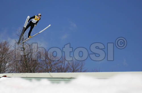 : David Lazzaroni of France soars through the air during qualification jump for Saturdays e.on Ruhrgas FIS Ski Jumping World Cup finals. Qualifications were held in Planica, Slovenia on 17.March 2006. 15 best placed ski jumpers in World Cup are automaticaly qualified for competition while next 25 ski jumpers needs to qualify for main competition through qualification jump.