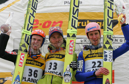 : Winner Bjoern Einar Romoeren of Norway (M), second placed Roar Ljoekelsoey of Norway (L) and third placed Martin Koch of Austria (R) are celebrating their medals won in e.on Ruhrgas FIS Ski Jumping World Cup finals. First race of FIS Ski Jumping World Cup finals was held in Planica, Slovenia on 18.March 2006.