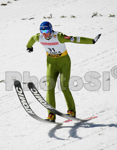 : Janne Ahonen of Finland lands at 217.5 meters in second jump of last race of e.on Ruhrgas FIS Ski Jumping World Cup finals. Last race of e.on Ruhrgas FIS Ski Jumping World Cup was held in Planica, Slovenia on 19.March 2006.
