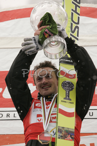 : Winner Adam Malysz of Poland celebrating his overall victory after last day of ski flying on FIS Ski jumping World Cup finals in Planica, Slovenia. FIS Ski jumping World Cup finals in Planica was held between 22nd and 25th of March 2007 in Planica, Slovenia. Last competition of ski flying was held in Planica on 25rd of March 2007.