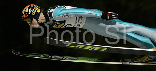 : Janne Happonen of Finland soars through the air in last race of Four Hill ski jumping tournament 2008 in Bischofshofen, Austria. Last race of 4 Hill ski jumping tournament 2008 was held in Bischofshofen, Austria on 6th of January 2008.