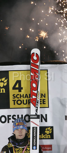 : Overall winner Janne Ahonen of Finland celebrating his fifth victory in Four Hill ski jumping tournament 2008 which ended in Bischofshofen, Austria. Last race of 4 Hill ski jumping tournament 2008 was held in Bischofshofen, Austria on 6th of January 2008.