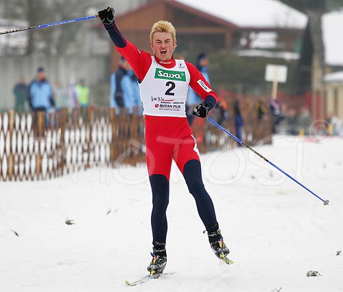 : Winner Petter Northug of Norway celebrating his victory on Junior Men finals of FIS Nordic Junior Ski World Championship sprint race were held in Medvode, Slovenia. Race was won by Petter Northug of Norway, Daniel Heun of Germany placed second, Anton Smirnov of Russia placed third, while Anders Gloersen of Norway finished fourth.