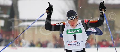 : Second placed Daniel Heun of Germany celebrating his second place on Junior Men finals of FIS Nordic Junior Ski World Championship sprint race were held in Medvode, Slovenia. Race was won by Petter Northug of Norway, Daniel Heun of Germany placed second, Anton Smirnov of Russia placed third, while Anders Gloersen of Norway finished fourth.