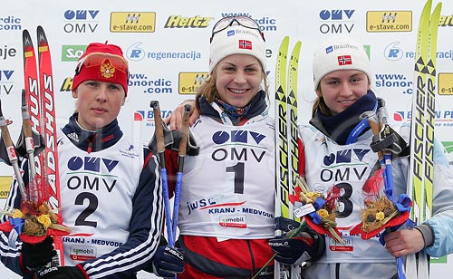 : Winner Astrid Jacobsen of Norway (M), second placed Natalia Matveeva of Russia (L) and third placed Celine Brun-Lie of Norway(R) celebrate their medals on Junior Women finals of FIS Nordic Junior Ski World Championship sprint race were held in Medvode, Slovenia.
