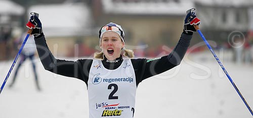 Medvode ,Slovenia - 31.01.2006 : Winner Guro Stroem Solli of Norway celebrating her victory in Under-23 Women finals of FIS Nordic Junior Ski World Championship sprint race were held in Medvode, Slovenia. Race was won by Guro Stroem Solli of Norway, Valentina Novikova of Russia placed second, Nicole Fessel of Germany placed third, while Petra Markelova of Czech finished fourth. Photo by: Primoz Jeroncic/PhotoSI