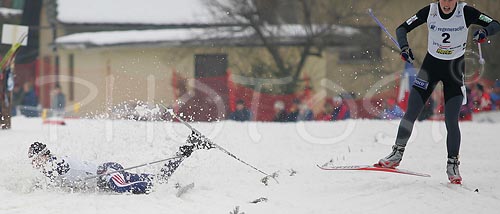 : Second placed Valentina Novikova of Russia falls during finish sprint of Under-23 Women finals of FIS Nordic Junior Ski World Championship sprint race were held in Medvode, Slovenia. Race was won by Guro Stroem Solli of Norway, Valentina Novikova of Russia placed second, Nicole Fessel of Germany placed third, while Petra Markelova of Czech finished fourth.