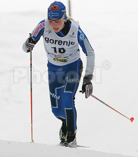 : Noora Virtanen of Finland skiing during Junior Women FIS Nordic Junior Ski World Championships 5km Classic race was held in Medvode, Slovenia. Race was won by Astrid Jacobsen of Norway, Eva Nyvltova of Czech placed second, while Charlotte Kalla of Sweden placed third.