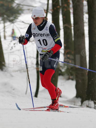 : Morgan Arritola of USA skiing during Junior Women FIS Nordic Junior Ski World Championships 5km Classic race was held in Medvode, Slovenia. Race was won by Astrid Jacobsen of Norway, Eva Nyvltova of Czech placed second, while Charlotte Kalla of Sweden placed third.