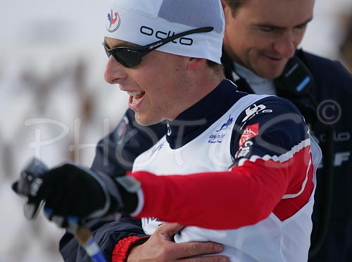 Medvode ,Slovenia - 01.02.2006 : Winner Francois Braud of France (L) and his trainer (R) celebrating Brauds title of Junior World Champion on the end of Junior Nordic Combined 10km pursuit race of FIS Nordic Junior Ski World Championship in Medvode, Slovenia. Race was won by Francois Braud of France, Tom Beetz of Germany placed second, while Miroslav Dvorak of Czech finished third. Photo by: Primoz Jeroncic/PhotoSI