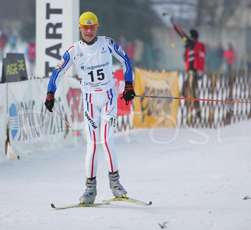 : Third placed Miroslav Dvorak of Czech celebrating his second place when crossing finish line in Junior Nordic Combined 10km pursuit race of FIS Nordic Junior Ski World Championship in Medvode, Slovenia. Race was won by Francois Braud of France, Tom Beetz of Germany placed second, while Miroslav Dvorak of Czech finished third.