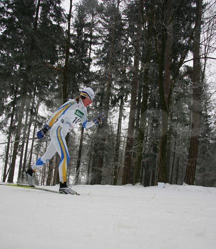 : Sofia Bleckur of Sweden skiing during Under-23 Women FIS Nordic Junior Ski World Championships 10km Classic race which was held in Medvode, Slovenia. Race was won by Justyna Kowalczyk of Poland, Irina Artemova of Russia placed second, while her teammate Ioulia Tchekalova of Russia placed third.