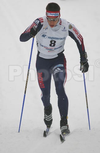 : Segej Shiraev of Russia skiing during Under-23 Men FIS Nordic Junior Ski World Championships 10km Classic race which was held in Medvode, Slovenia. Race was won by Franz Goering of Germany, Maxim Bulgakov of Russia placed second, while his teammate Alexander Legkov of Russia placed third.