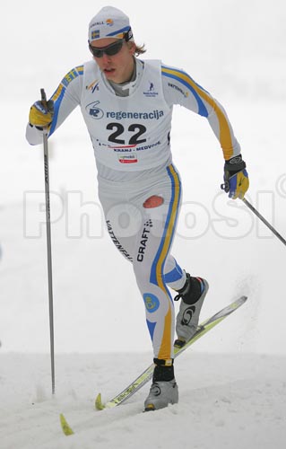 : Fredrik Uusitalo of Sweden skiing during Under-23 Men FIS Nordic Junior Ski World Championships 10km Classic race which was held in Medvode, Slovenia. Race was won by Franz Goering of Germany, Maxim Bulgakov of Russia placed second, while his teammate Alexander Legkov of Russia placed third.