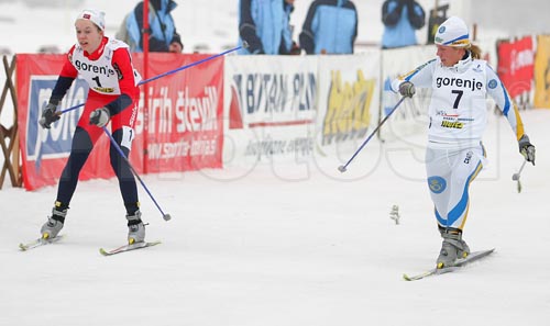 : Emma Begmann of Sweden (R) and Marte Elden of Norway sprinting into finish for 5th place of Junior Women FIS Nordic Junior Ski World Championships 5+5km pursuit race which was held in Medvode, Slovenia.