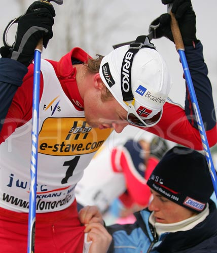 : Winner Petter Northug of Norway resting exhausted after winning Junior Men FIS Nordic Junior Ski World Championships 10+10km pursuit race which was held in Medvode, Slovenia.