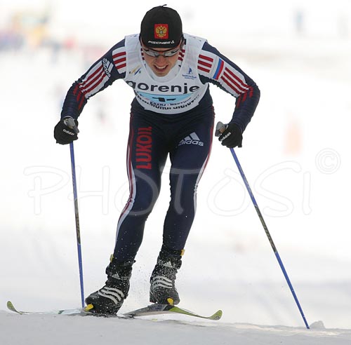 : Illia Chernousov of Russia skiing during Junior Men FIS Nordic Junior Ski World Championships 4x5km relay race which was held in Medvode, Slovenia. Race was won by Norway, Russia placed second, while relay of Czech finished third.
