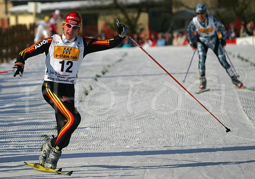 : Winner Tom Beetz is celebrating his gold medal and crosses finish line of Junior Nordic Combined sprint race of FIS Nordic Junior Ski World Championships which was held in Medvode, Slovenia on 5.February 2006.