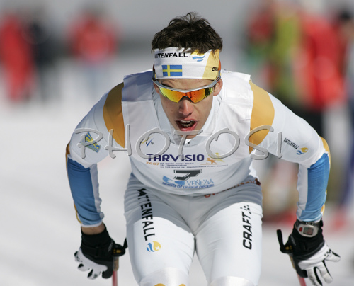 : Marcus Hellner of Sweden skiing in qualifications for Men Under23 Sprint race of Junior Nordic skiing World Championships in Tarvisio, Italy. Qualifications for Men Sprint race of Junior Nordic skiing World Championships in Tarvisio, Italy were held on 13th of March 2007 in Fusine, Italy. Due warm weather and lack of snow, cross country skiing races of Junior Nordic skiing World Championships 2007 were moved from Tarvisio, Italy to Fusine, Italy.