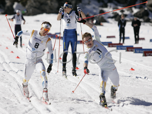 : Winner Robin Bryntesson of Sweden (R) and his teammate, second placed Marcus Hellner (L) are sprinting for victory, while Matias Strandvall of Finland (M) secured his third placed already before finish line of Men Under23 Sprint race of Junior Nordic skiing World Championships in Tarvisio, Italy. Men Sprint race of Junior Nordic skiing World Championships in Tarvisio, Italy was held on 13th of March 2007 in Fusine, Italy. Due warm weather and lack of snow, cross country skiing races of Junior Nordic skiing World Championships 2007 were moved from Tarvisio, Italy to Fusine, Italy.