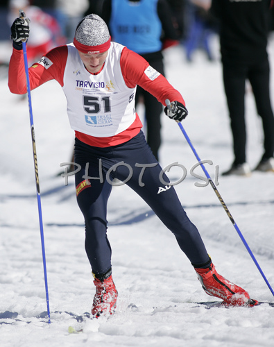 : Domen Potocnik of Slovenia skiing in Men 10km freestyle race of Junior Nordic skiing World Championships in Tarvisio, Italy. Men 10km freestyle race of Junior Nordic skiing World Championships in Tarvisio, Italy was held on 14th of March 2007 in Fusine, Italy. Due warm weather and lack of snow, cross country skiing races of Junior Nordic skiing World Championships 2007 were moved from Tarvisio, Italy to Fusine, Italy.