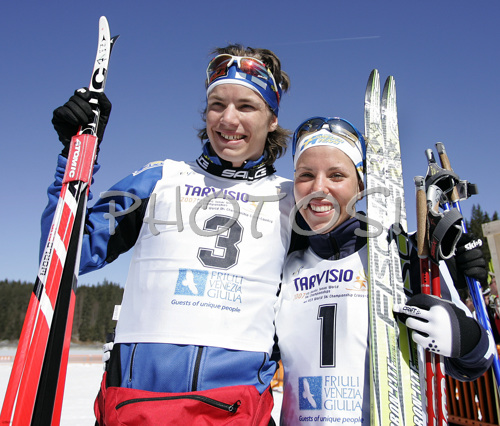 : Winner in men Martti Jylhae of Finland and winner in women race Charlotte Kalla of Sweden after finish of Men 10km freestyle and Women 5km freestyle race of Junior Nordic skiing World Championships in Tarvisio, Italy. Freestyle races of Junior Nordic skiing World Championships in Tarvisio, Italy was held on 14th of March 2007 in Fusine, Italy. Due warm weather and lack of snow, cross country skiing races of Junior Nordic skiing World Championships 2007 were moved from Tarvisio, Italy to Fusine, Italy.