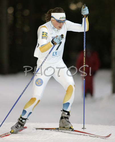 : Anna Simberg of Sweden skiing in Women 5km freestyle race of Junior Nordic skiing World Championships in Tarvisio, Italy. Women 5km freestyle race of Junior Nordic skiing World Championships in Tarvisio, Italy was held on 14th of March 2007 in Fusine, Italy. Due warm weather and lack of snow, cross country skiing races of Junior Nordic skiing World Championships 2007 were moved from Tarvisio, Italy to Fusine, Italy.