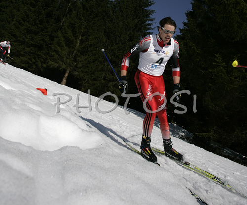 : Winner Dario Cologna of Switzerland skiing in Men 15km freestyle race of Under23 Nordic skiing World Championships in Tarvisio, Italy. Men 15km freestyle race of Under23 Nordic skiing World Championships in Tarvisio, Italy was held on 15th of March 2007 in Fusine, Italy. Due warm weather and lack of snow, cross country skiing races of Junior Nordic skiing World Championships 2007 were moved from Tarvisio, Italy to Fusine, Italy.