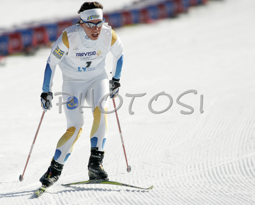 Tarvisio ,Italy - 16.03.2007 : Winner Charlotte Kalla of Sweden skiing in Women 5+5km pursuit race of Junior Nordic skiing World Championships in Tarvisio, Italy. Women 5+5km pursuit race of Junior Nordic skiing World Championships in Tarvisio, Italy was held on 16th of March 2007 in Fusine, Italy. Due warm weather and lack of snow, cross country skiing races of Junior Nordic skiing World Championships 2007 were moved from Tarvisio, Italy to Fusine, Italy. Photo by: Primoz Jeroncic/PhotoSI