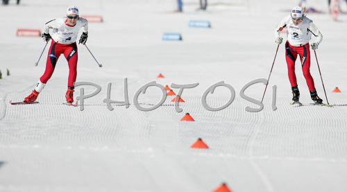: Second placed Marte Monrad-Hansen of Norway (L) and third placed Therese Johaug of Norway (R) sprinting for silver in Women 5+5km pursuit race of Junior Nordic skiing World Championships in Tarvisio, Italy. Women 5+5km pursuit race of Junior Nordic skiing World Championships in Tarvisio, Italy was held on 16th of March 2007 in Fusine, Italy. Due warm weather and lack of snow, cross country skiing races of Junior Nordic skiing World Championships 2007 were moved from Tarvisio, Italy to Fusine, Italy.Photo by: Primoz Jeroncic/PhotoSI